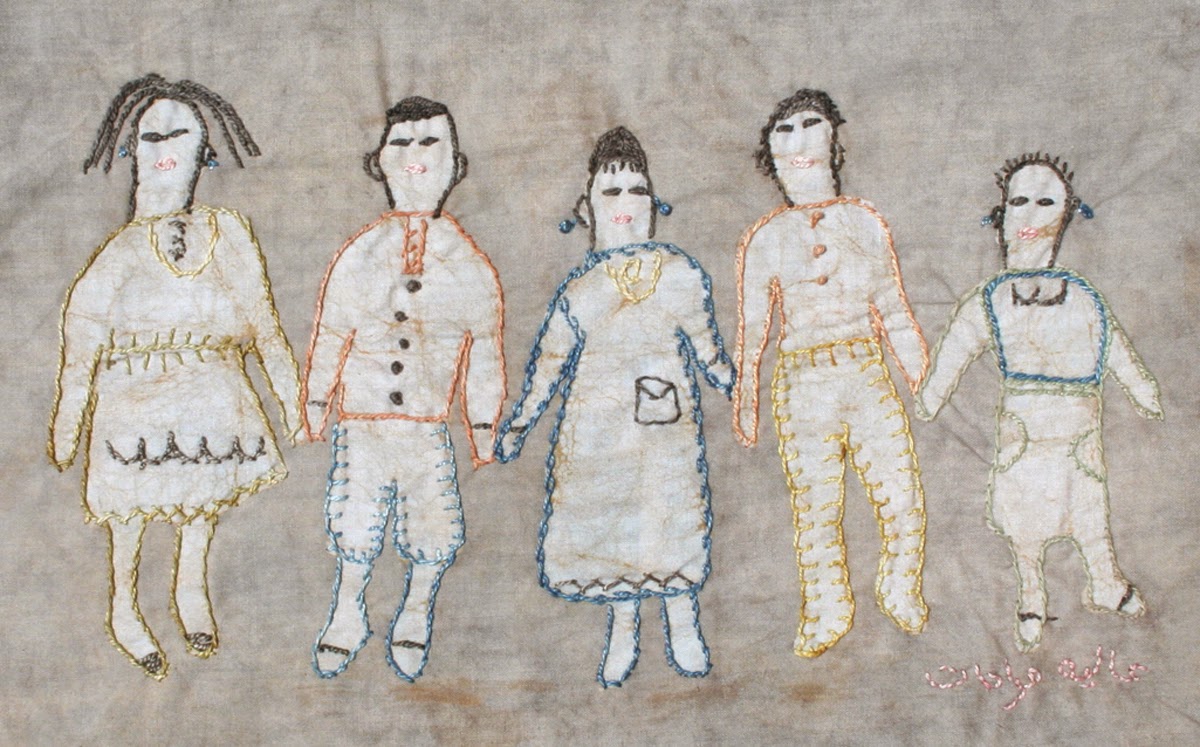 Our families will always be our main love and inspiration so we enjoy embroidering these images of our children - using thread dyed only with plants and minerals. The image is made with a resist that uses mud from the Dead Sea.